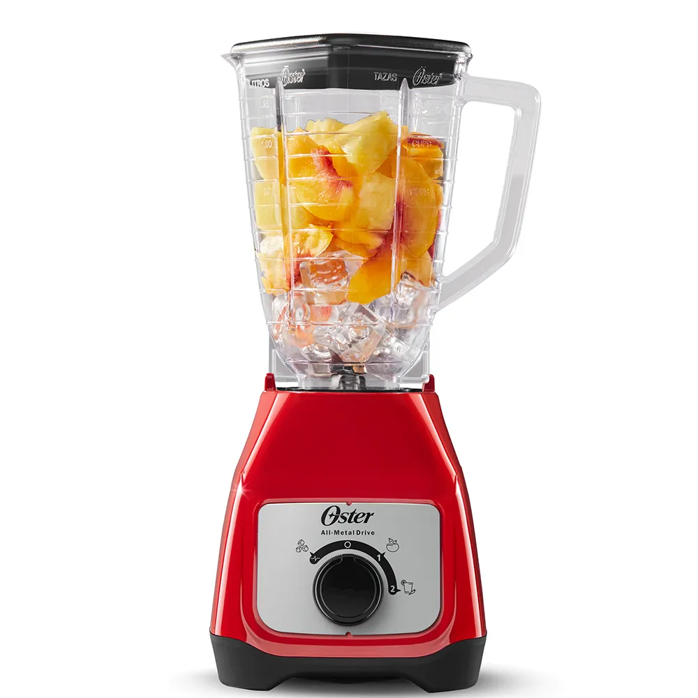 Licuadora Oster con vaso de plástico y control de perilla roja